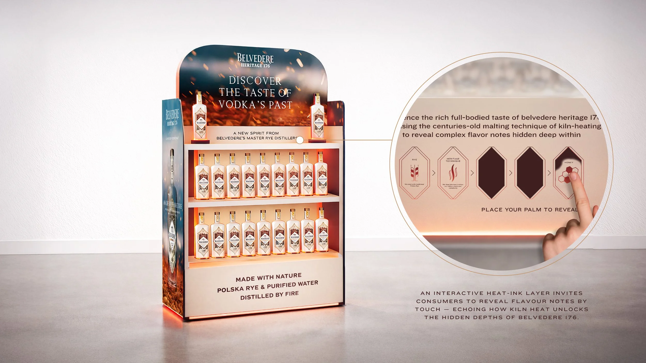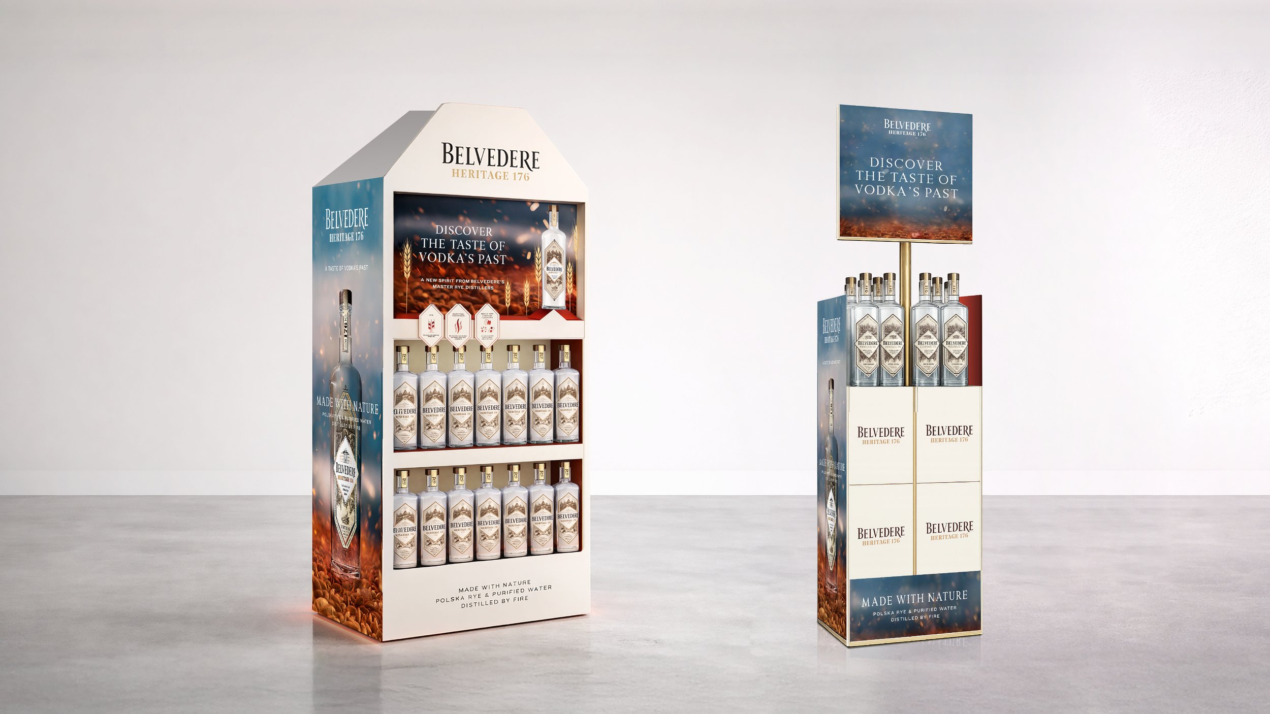 Launch Belvedere Heritage 176 in travel retail and off-trade environments with a cohesive brand experience that communicated the product's heritage, craft, and flavour story across multiple touchpoints—from large-format displays to consumer takeaway samples.